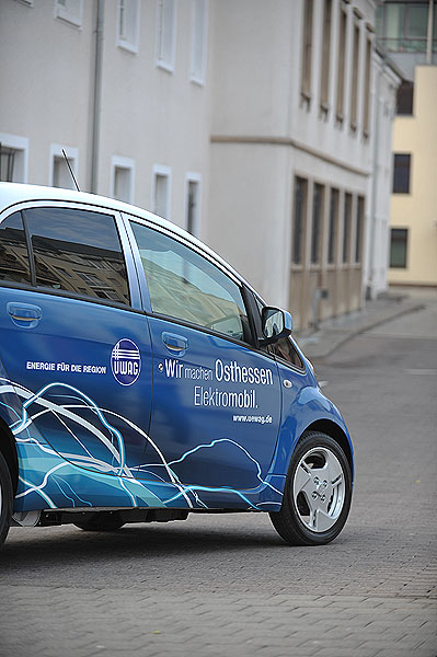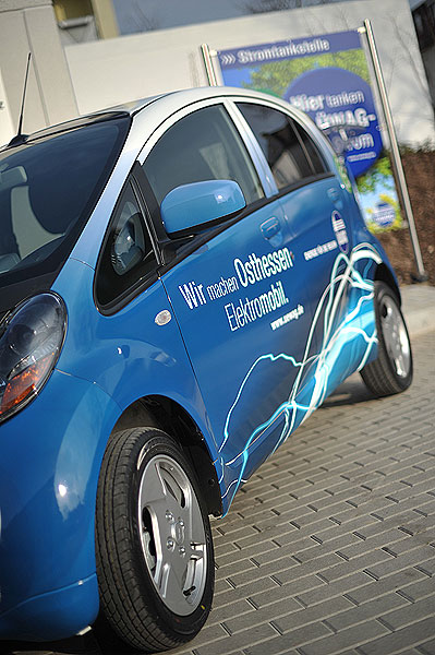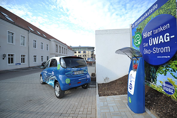 Auch eine Stromtankstelle am Standort der Kreisverwaltung gehört zum Feldversuchs-Paket. Hier kann das Elektroauto jederzeit auftanken. Geladen wird ausschließlich ÜWAGÖko, der zertifizierte Strom der ÜWAG aus regenerativen Quellen. Bei dem Fahrzeug handelt es sich um den i-MiEV (Mitsubishi Innovative Electronic Vehicle), ein reines Elektroauto.