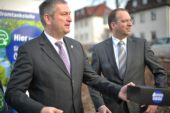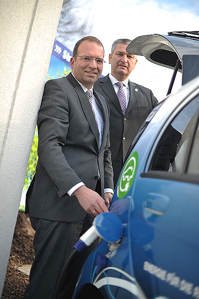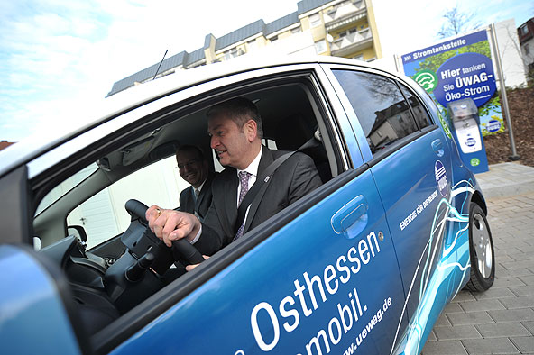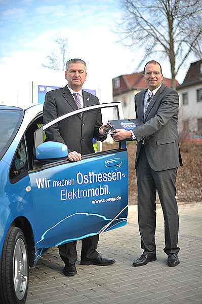 Fulda. Mit der Übergabe eines ausschließlich elektrisch angetriebenen Pkw, in dem bis zu vier Personen Platz finden, startete die ÜWAG jetzt ihren zweiten Feldversuch zur Elektromobilität in der Region. Partner ist der Landkreis Fulda. Dipl.-Kfm. Ralf-Stefan Stöppler, Leiter des Bereichs Beteiligungen und Konzessionsmanagement der ÜWAG, übergab das Fahrzeug an Landrat Bernd Woide und sein Team.
