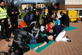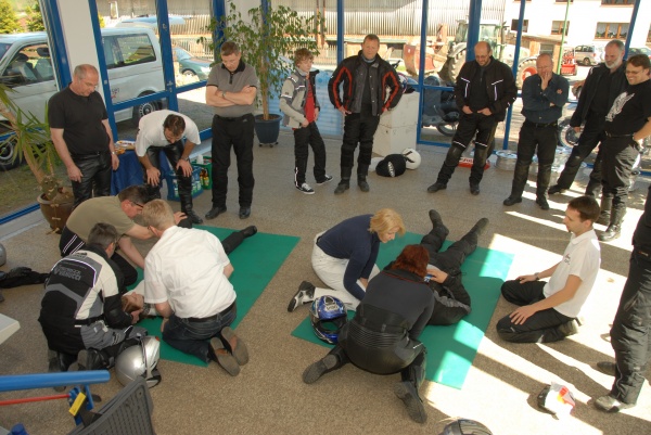 Fulda. Die Malteser aus Fulda veranstalteten in Kooperation mit der Firma Busch & Wagner einen etwas anderen Erste Hilfe Kurs speziell für Motorradfahrer. Nach dem theoretischen Einstieg, machten sich die Biker mit ihrem Motorrad auf den Weg durch die Rhön. Die Strecke führte an verschiedenen Erste Hilfe Stationen vorbei. Hier galt es möglichst schnell das theoretisch erworbene Wissen in die Praxis umzusetzen. Die Teilnehmer und Teilnehmerinnen übten wie der Helm richtig abgenommen wird oder wie ein Druckverband eine bedrohliche Blutung stoppt. Darüber hinaus gestaltete die Fahrschule Auth eine Übungseinheit zum richtigen Bremsen in der Kurve. „Die Begeisterung der Teilnehmer war deutlich zu spüren, denn einige fragten bereits nach einer Fortsetzung“, weiß Matthias Krause, Ausbildungsreferent von Malteser und ergänzt, „die es mit Sicherheit geben wird“.